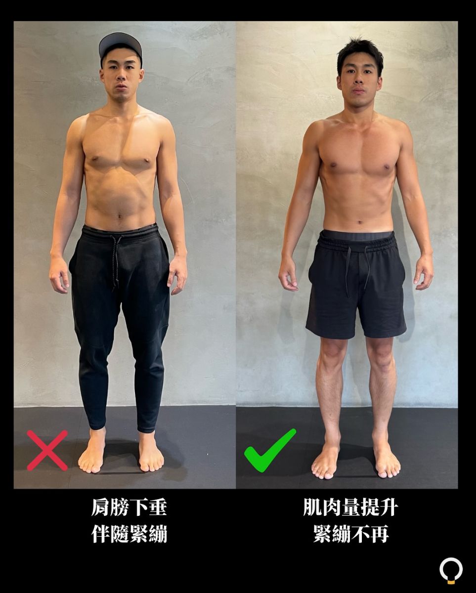 ✅ 站姿:肌肉量提升,並逐漸建立中立站姿。肩膀更有支撐,胸椎位置更趨中立。