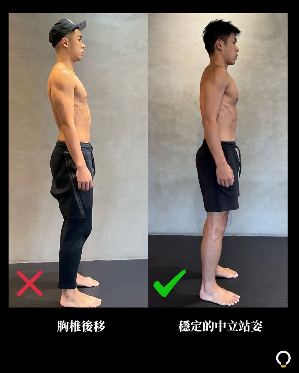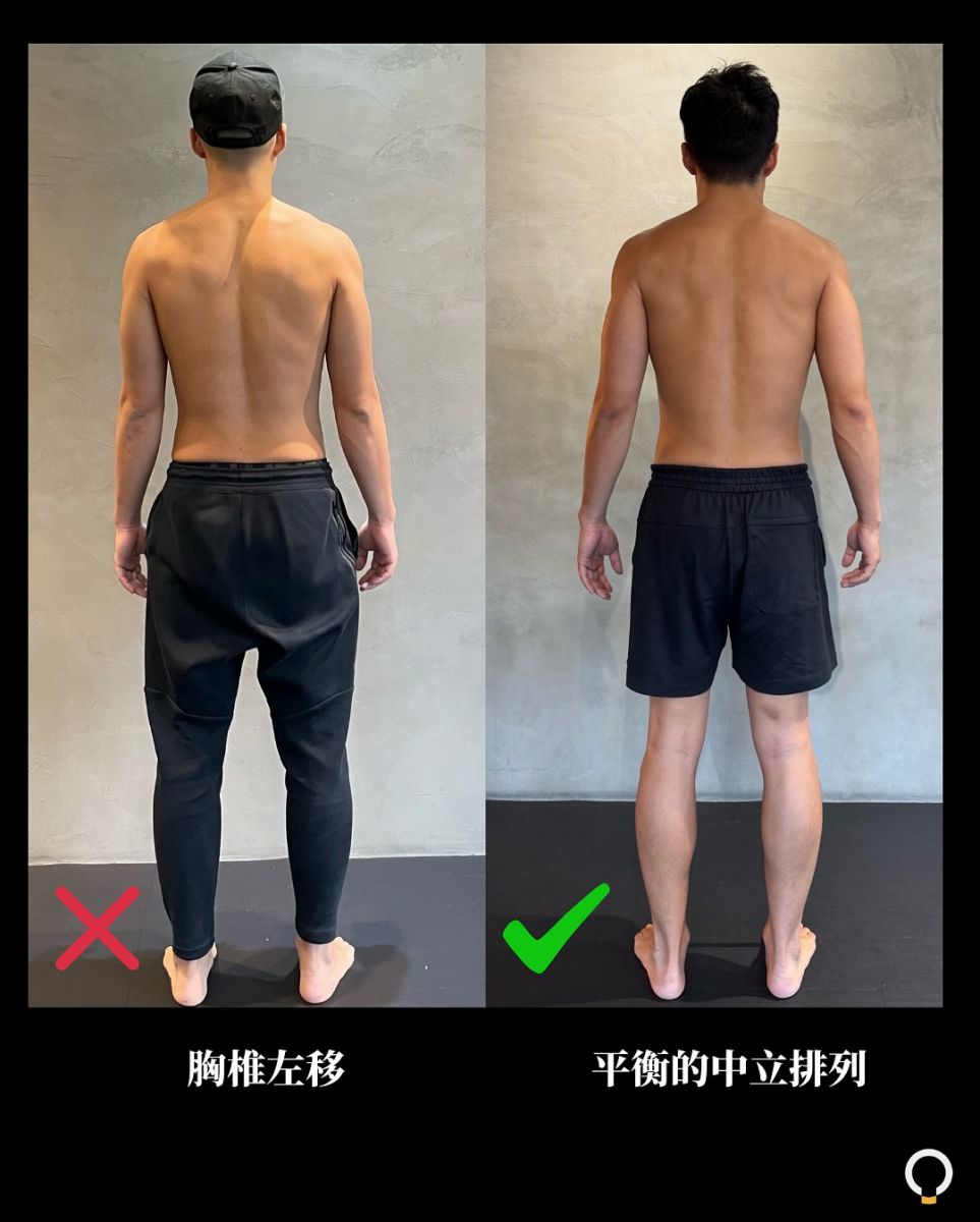 ❌ 站姿:腰椎前移(anterior shift)、胸椎後移(posterior shift)、肩膀下壓、上胸椎左側偏移(lateral shift)。