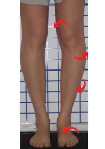 股骨內旋、小腿外旋、膝蓋偏移、脛骨彎曲、腳踝過度內旋、足弓塌陷。